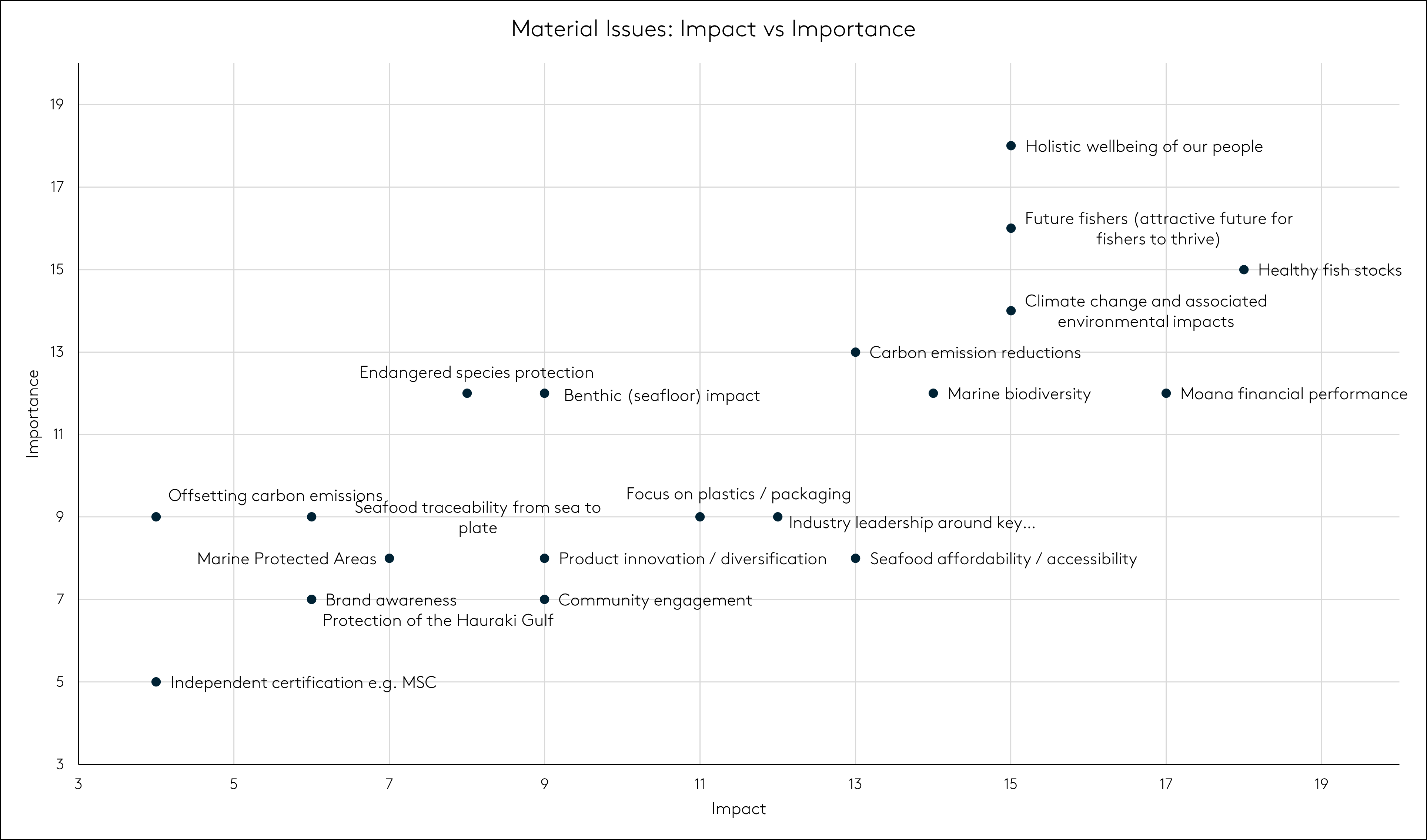 I te tau nei, kua whakawhānui mātou i te tirohanga ki ētahi kaupapa pēnei me tō Moana whanonga pūtea, te hāngai ki ngā whāinga o te Whakataunga Tiriti, me te kaha o te ingoa, i te taha o ngā wāhanga māori noa, arā ko ngā tāngata, ngā wāhi, ngā hua, me te tiakanga mahinga ika. Ka whai ā mātou tikanga mahi i te International Integrated Reporting Council Framework, me ngā pae a te Global Reporting Initiative.
